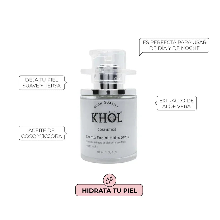 La Crema facial hidratante Khöl Cosmetics es una fórmula rica en emolientes, extractos y aceites naturales que buscan hidratar tu piel, dejándola suave y tersa. Es perfecta para usar de día y de noche, antes de tu maquillaje, luego del Suero Antiedad Khöl e igual al acostarte.